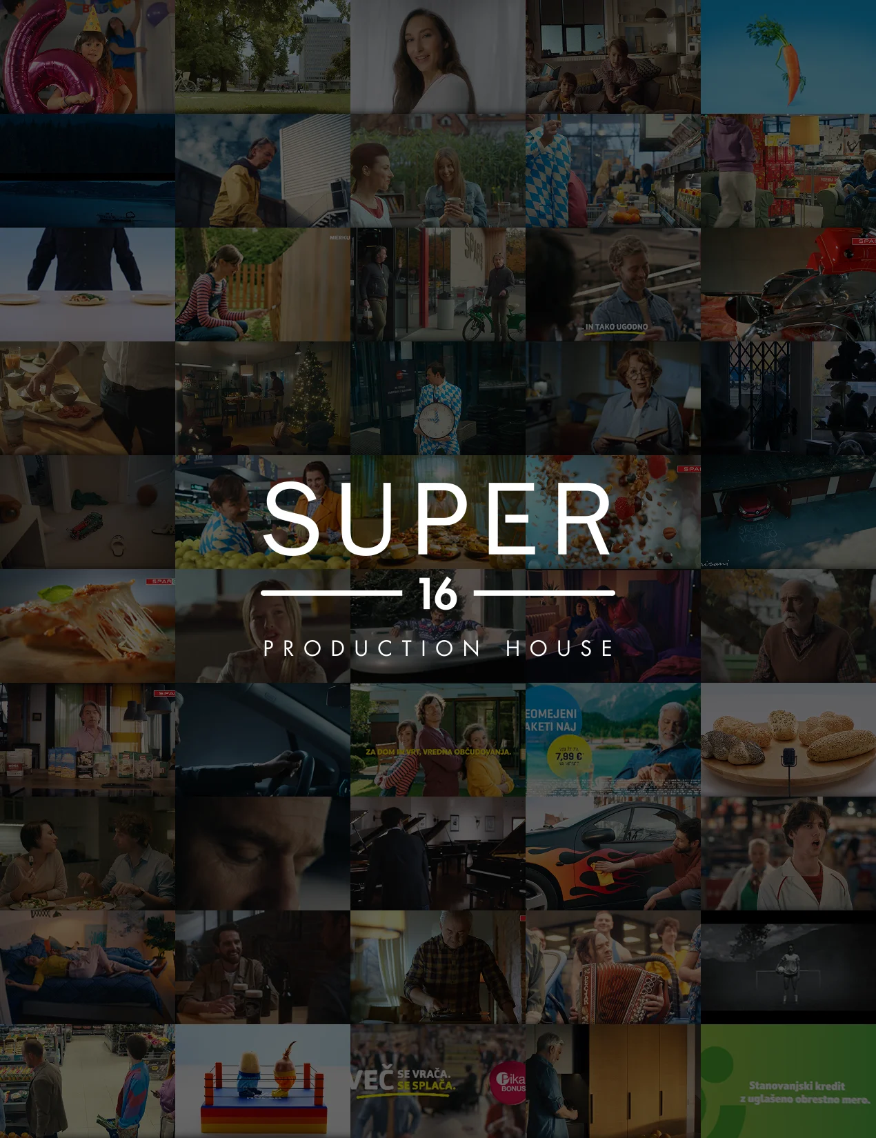 Številne slovenske oglaševalske agencije nam zaupajo izvedbo vseh vrst projektov, saj sodelujemo tudi z mednarodnimi oglaševalskimi agencijami in produkcijskimi hišami. Predstavljamo srce Super16 – ekipo kreativnih ljudi, ki ne ustvarjajo le oglasov, ampak pripovedujejo zgodbe. Zgodbe za ljudi in o njih. In to nas dela uspešno produkcijsko hišo v Sloveniji.